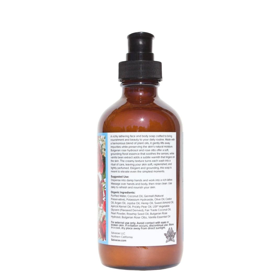 A richly lathering face and body soap crafted to bring nourishment and beauty to your daily routine. Made with a harmonious blend of plant oils, it gently lifts away impurities while preserving the skin’s natural moisture. Bulgarian rose hydrosol and rose otto offer a soft, grounding floral essence that soothes the senses, while vanilla bean extract adds a subtle warmth that lingers on the skin. The creamy texture turns each wash into a ritual of care, leaving your skin soft, replenished, and lightly perfumed. Elegant and grounding, this soap is meant to elevate even the simplest moments.